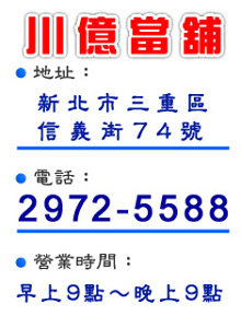 川億當鋪主要營業項目是以動產借、長、短期融資為主,收當項目包含 :各類汽車借款、機車借錢及工程車輛、船舶、機械、黃...